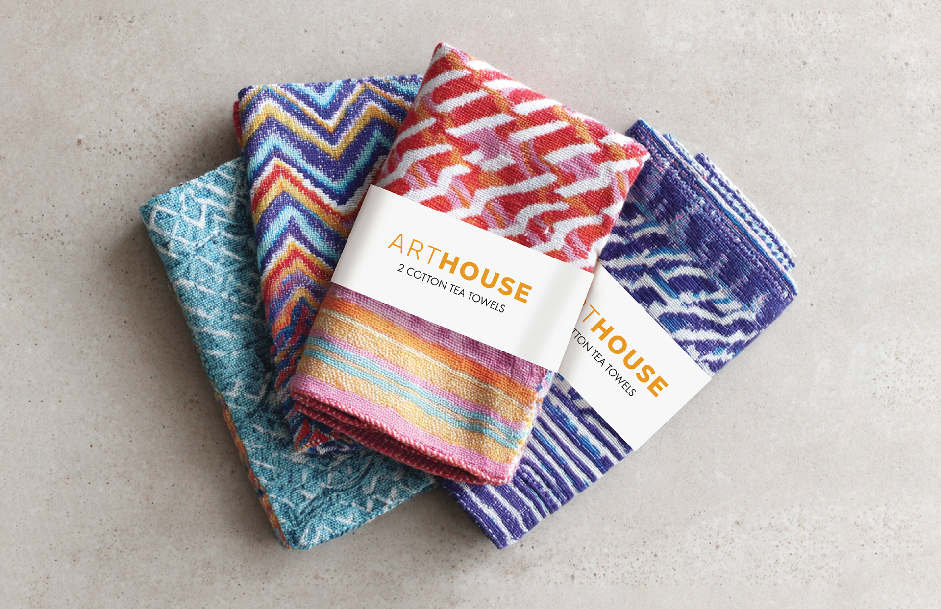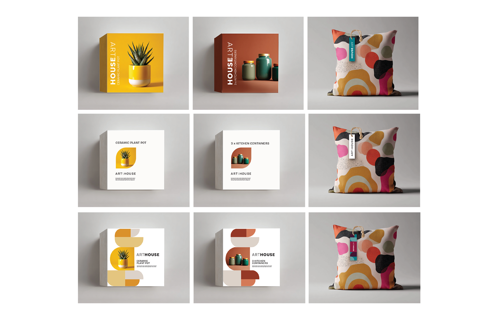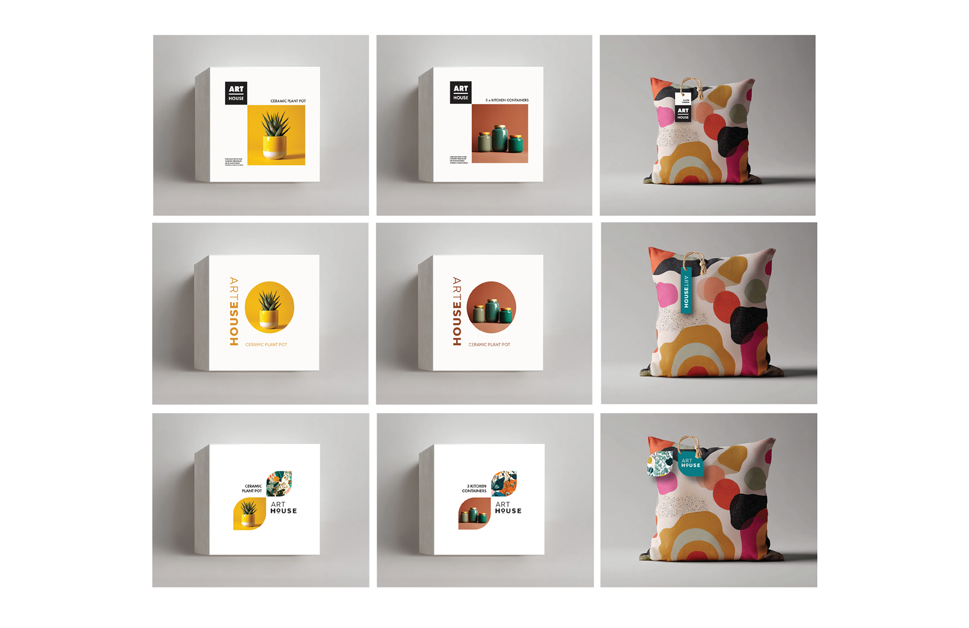 Briscoes have several lifestyle product brands within their stores. Arthouse carries a range of colourful, unusual and 'arty' homewares. Although the brand needed to be clear in its positioning it also has to sit within the overall Bricsoes umbrella. There was the added challenge of not having complete control over packaging production as much is produced on-site in the products country of origin. This meant taking into account the difficulty of full-bleed packaging, of consistent photography and of substrates.