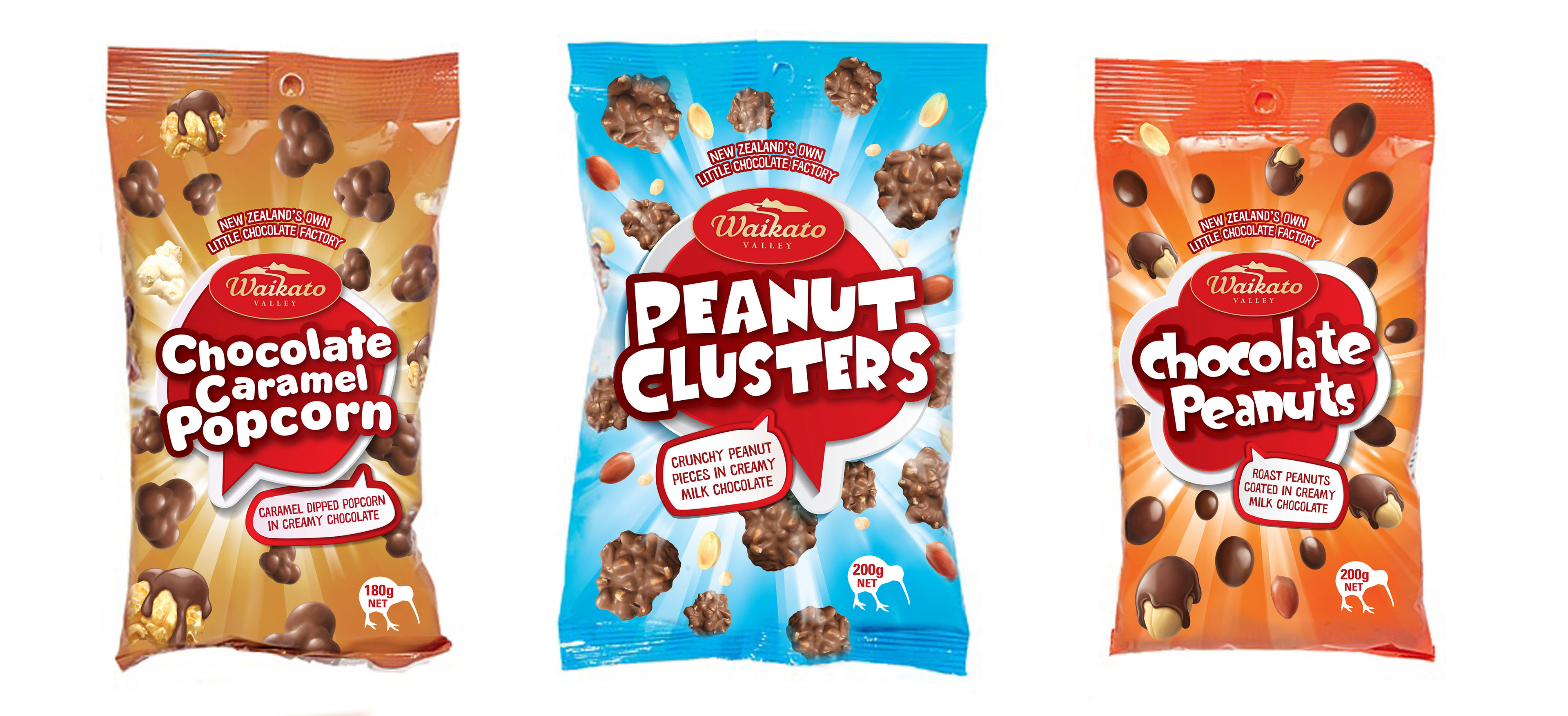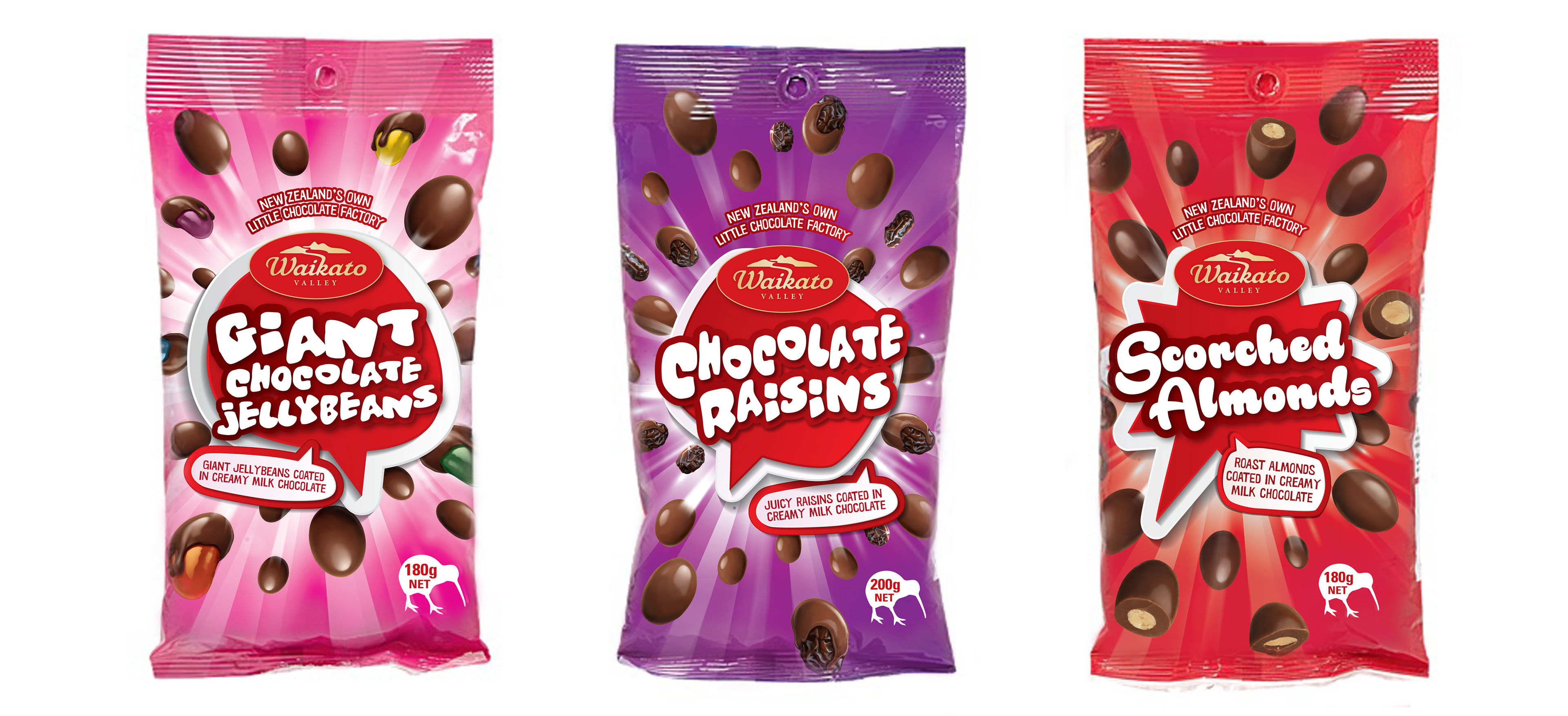 Waikato Valley Chocolates were a mainstream brand sold through the Warehouse and poisitioned to go up against Cadbury. These are flexo printed so in order to keep the colours bright we went super bright and crazy.